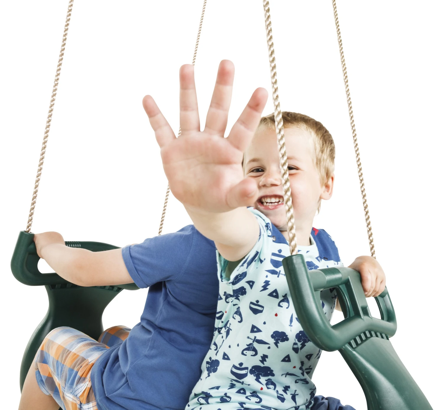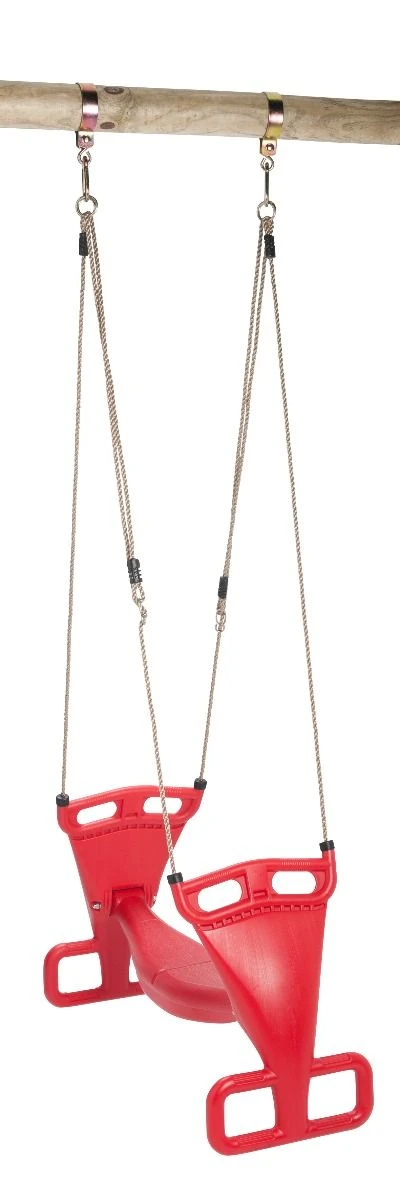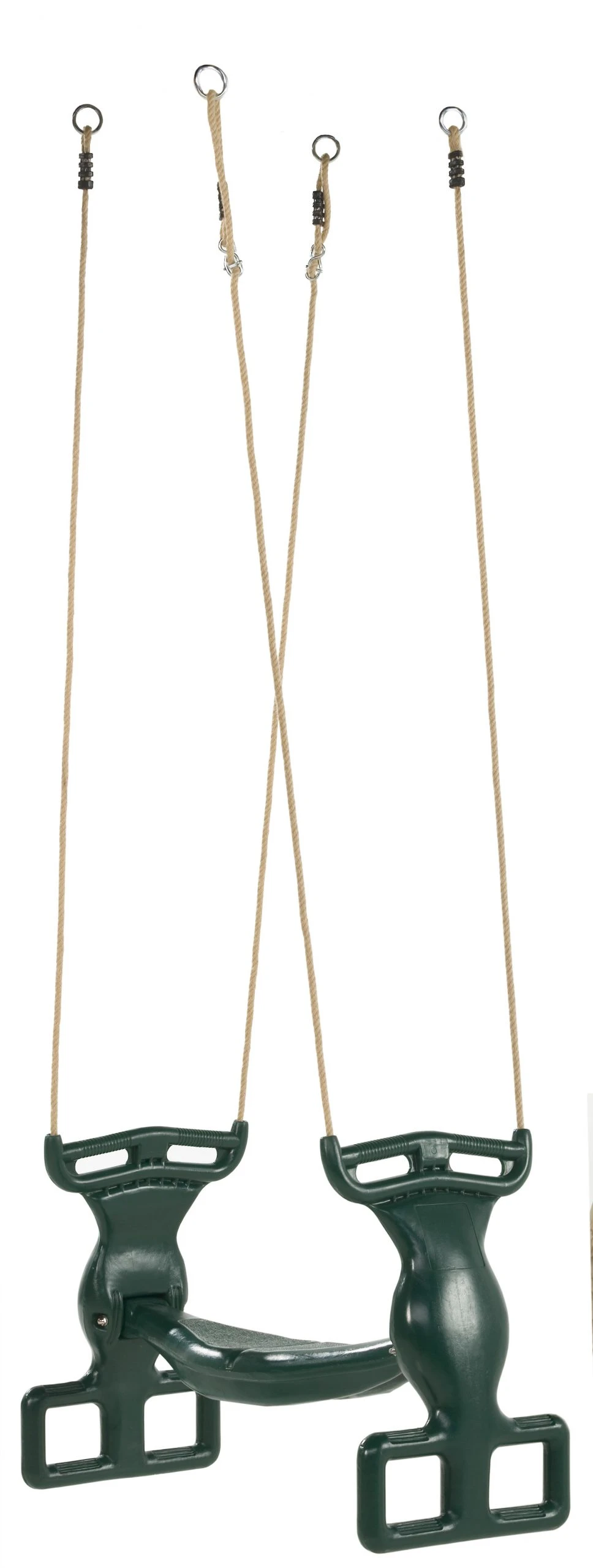 Dubbelzit “rug aan rug”. PH-touwenset, kleur groen. Het zitje is uitgevoerd in geblazen kunststof HDPE, ringen en stelachten zijn uit gegalvaniseerd staal en zwarte kunststof lassen als touwverbinding.