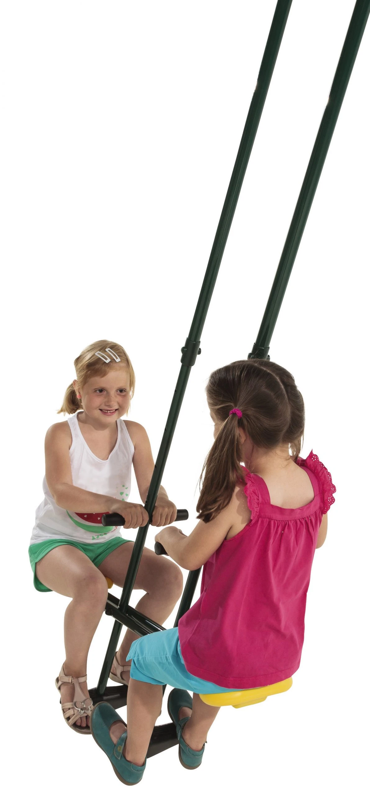 Het frame heeft een diameter van 25 mm. en is gepoedercoat. De duoschommel wordt als eenvoudig bouwpakket aangeleverd.