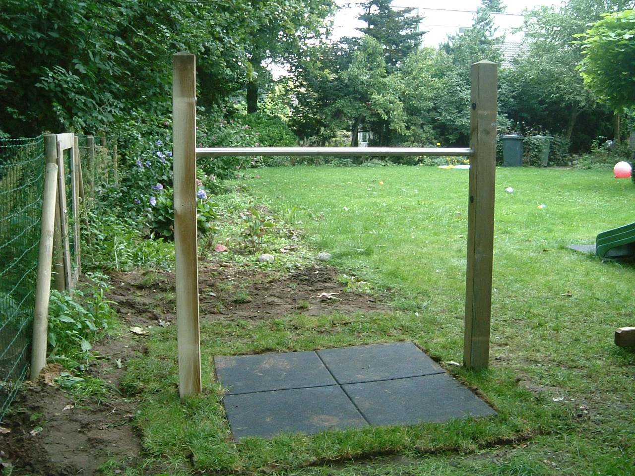 Duikelrek opgebouwd uit 2 geïmpregneerde houten staanders (9 x 9 cm) met diamantkop en een roestvast stalen buis welke gemonteerd is in de ingefreesde gaten van de staanders.