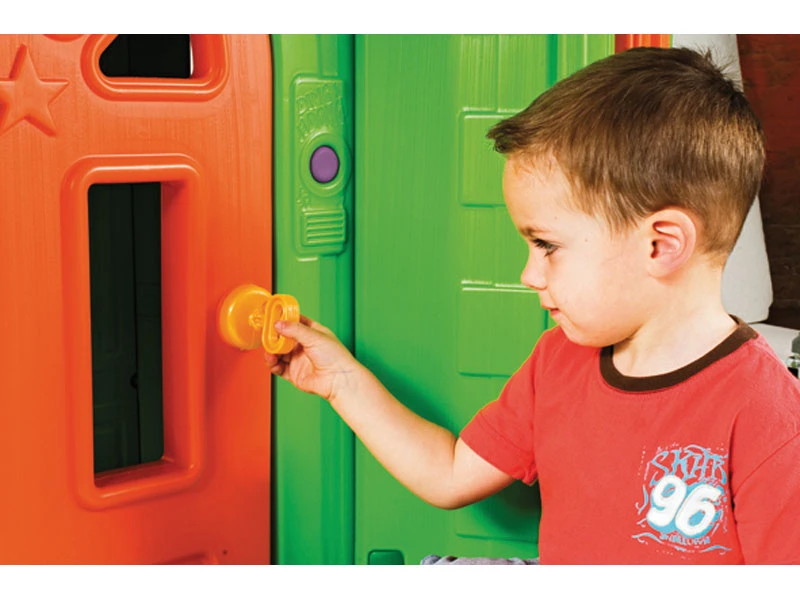 Speelhuis met veel details. Inclusief toonbank + bankje aan de achterzijde, raam met luiken, deurbel met verschillende geluiden, FM-radio, realistisch klinkend slot.