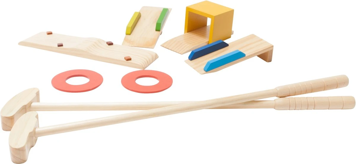 De set bestaat uit 2 ballen, 2 holes,, 2 sticks en 4 handicaps.