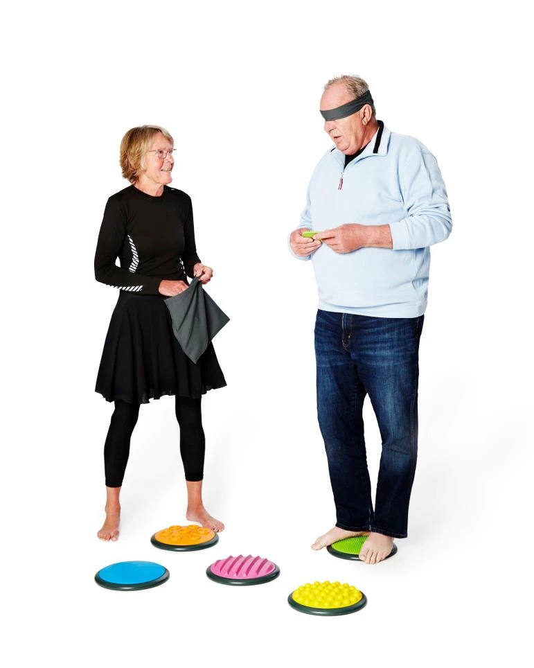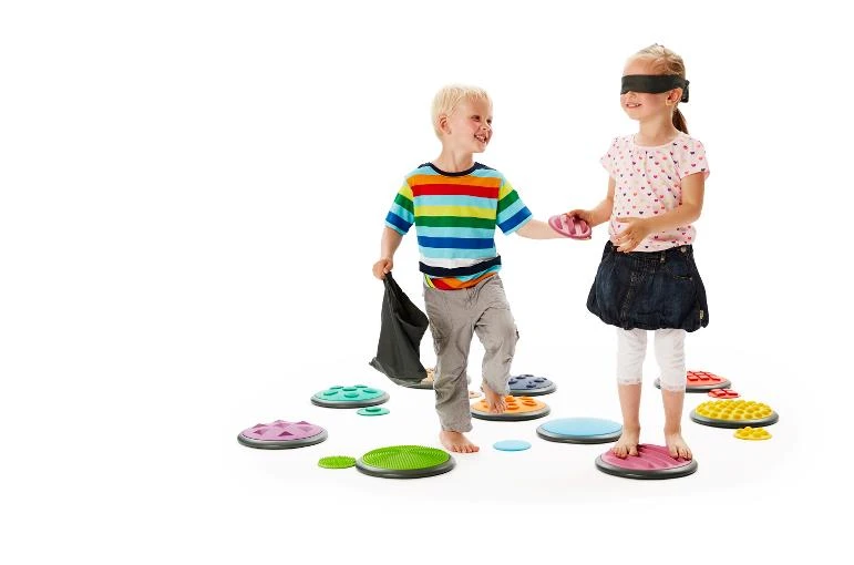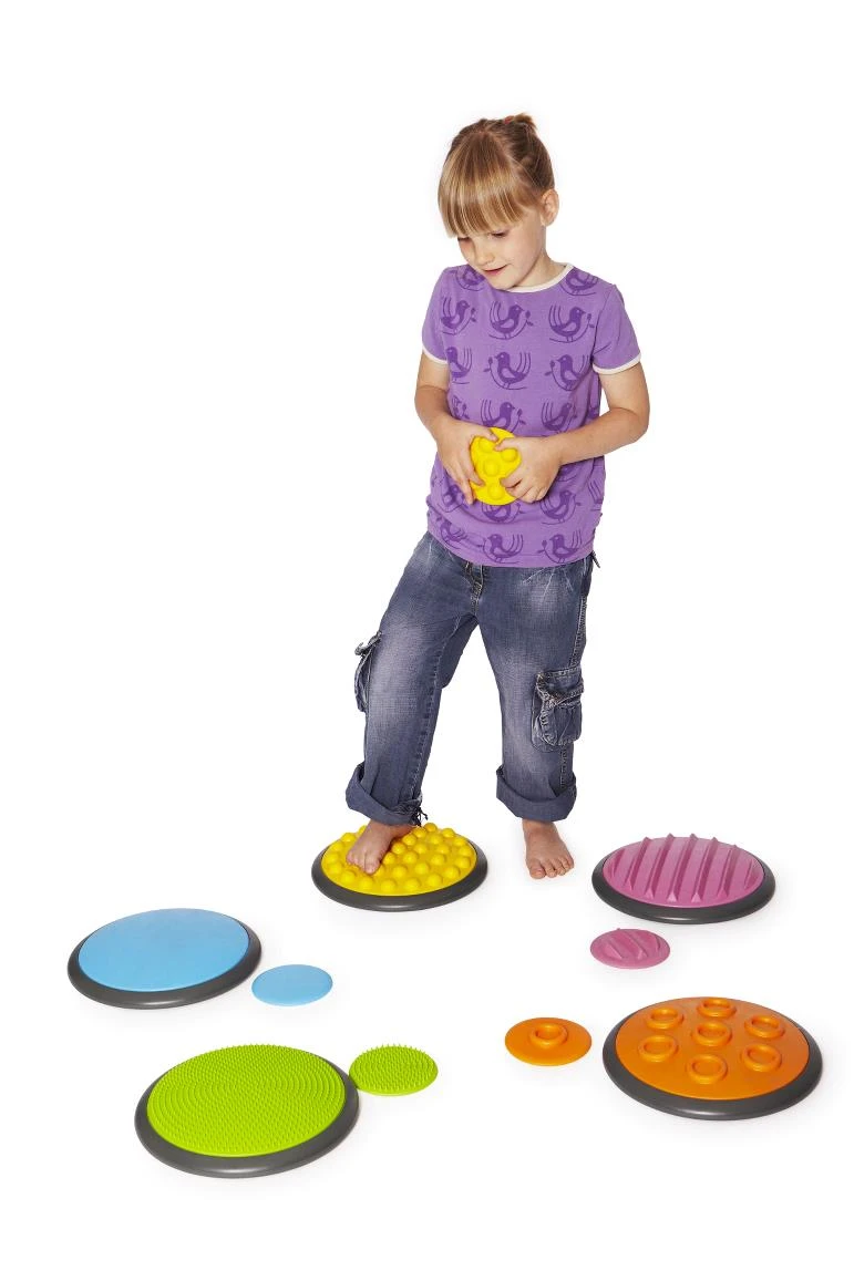 Uitdagend spelmateriaal dat de zintuigen prikkelt en de tastzin van handen en voeten stimuleert. Gelijktijdig wordt het vermogen om gevoelsindrukken verbaal te omschrijven ontwikkeld.Er zijn 2 verschillende sets met steeds 5 grote en 5 kleine discs.