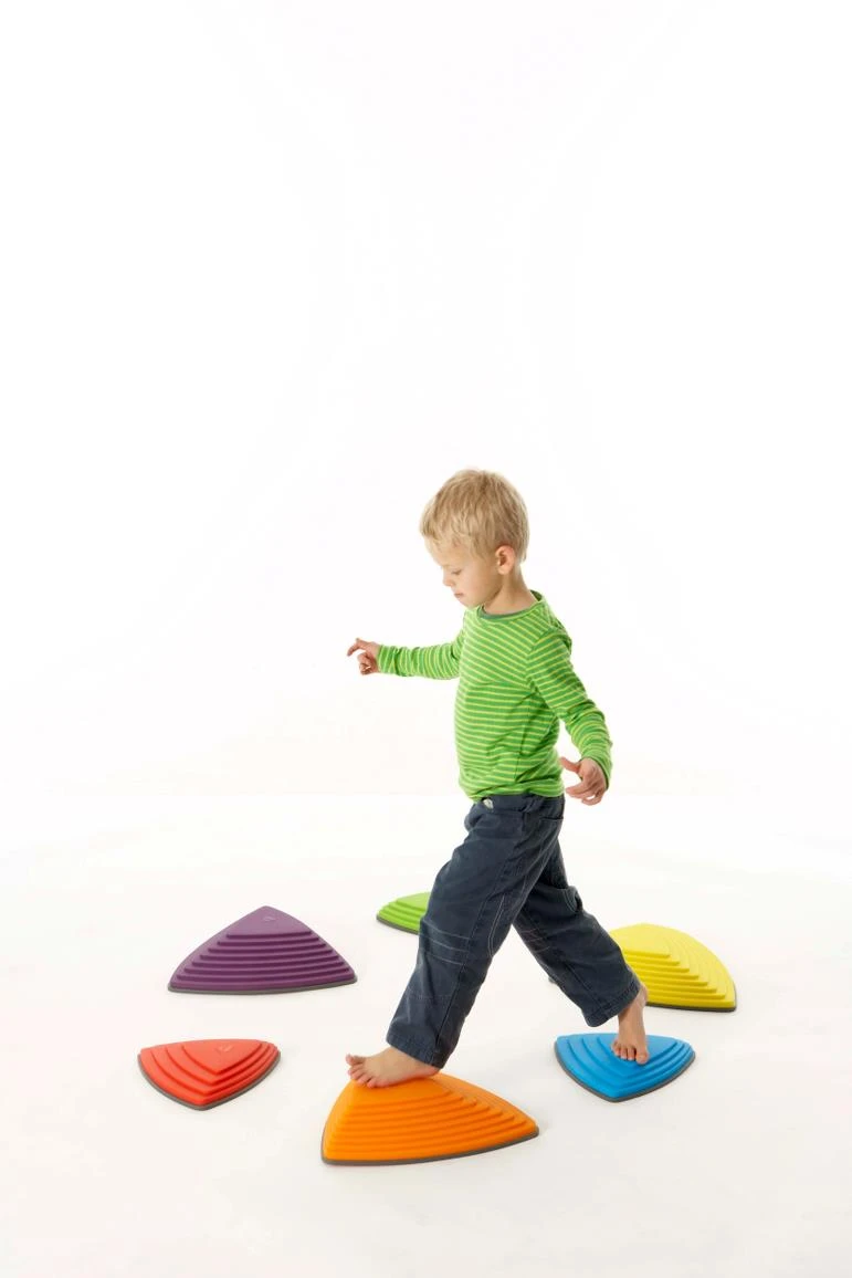 Oefenen op deze stapstenen vergroot het zelfvertrouwen, verbetert het inschatten van afstanden, de coördinatie en traint zowel het dynamisch als statische evenwicht.