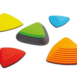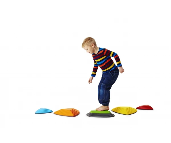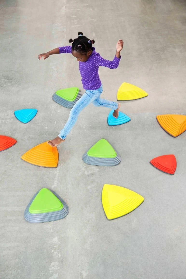 Deze nieuwe versie van de River Stone Set heeft 1 stapsteen met een zachte rubber onderkant en een hardtop platform ondersteund door drie sterke stalen veren om veren mogelijk te maken. Stappen en springen op de Bouncing River Stone is fysiek uitdagender dan op een gewone riviersteen omdat dit extra aanpassing vereist via de enkels en benen, wat het proprioceptieve gevoel versterkt. Vanaf 2 jaar.