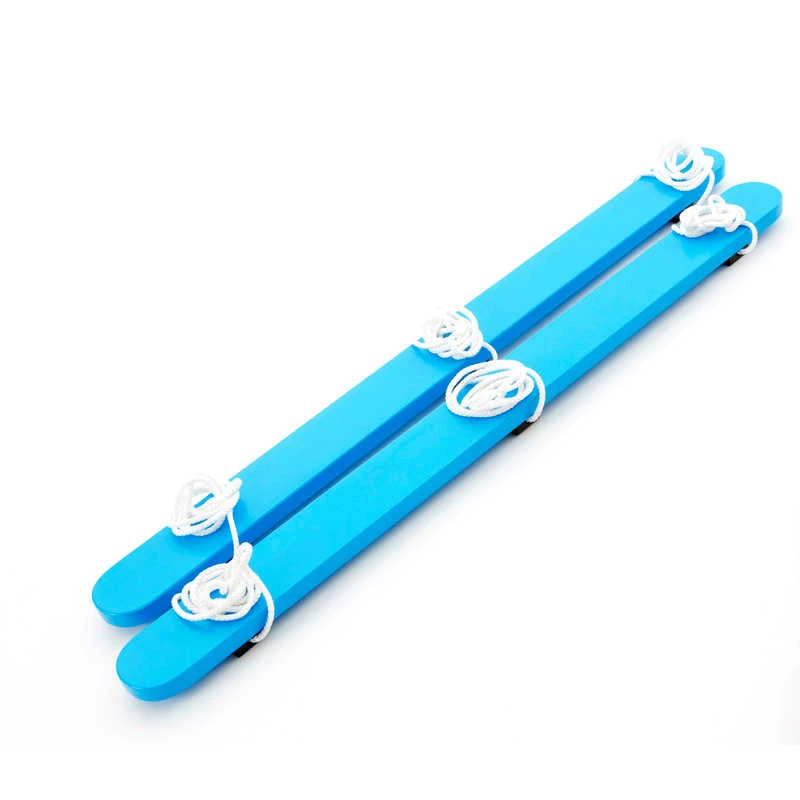 Set van 2 reuzenski’s, vervaardigd uit hout en aan de onderzijde voorzien van anti-slip rubber klossen om de vloer bij indoor gebruik te beschermen.
