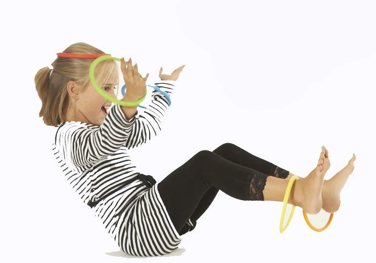 Mooie, nieuwe, kleurige ringen. Deze ringen dagen uit tot talloze activiteiten; dansen in een kring, balanceren met de ringen op het hoofd, jongleren met de ringen aan armen en benen, overgooien enz. enz.