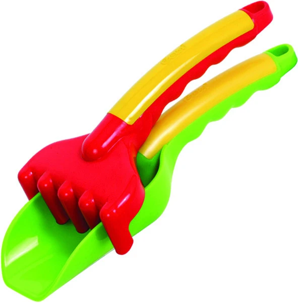 Set van kunststof harkje en schepje voor in de zandbak van het merk Gowi. De set is gemaakt uit hoogwaardige en veilige materialen.