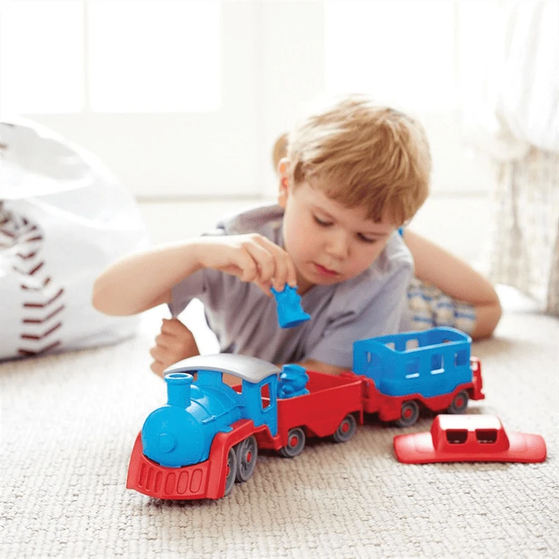 Iedereen aan boord! De Green Toys Trein rijdt het station uit! Deze stevige locomotief is klaar om van het ene milieuvriendelijke avontuur naar het andere te tuffen. Deze felgekleurde locomotief trekt twee extra wagons die aan elkaar gekoppeld zijn om een lange trein te vormen, of gemakkelijk los te maken om zelfstandig mee te kunnen spelen. De open wagon is perfect voor het vervoeren van allerlei soorten duurzame lading, terwijl de passagierswagon een ruim interieur en een afneembaar dak heeft. Bij de set worden twee spoorwegfiguren meegeleverd, die open spel aanmoedigen, aangezien de verbeeldingskracht van kleine ingenieurs de sporen vormt voor allerlei creatieve verhalen. Zonder metalen assen of externe coatings is de Green Toys-trein veilig en veelzijdig voor zowel binnen- als buitenspelen. Veilig, niet giftig; bevat geen BPA, PVC, ftalaten of externe coatings. Vaatwasmachinebestendig voor eenvoudige reiniging. Gegarandeerd urenlang Good Green Fun! Bestaat uit 4 speelstukken.