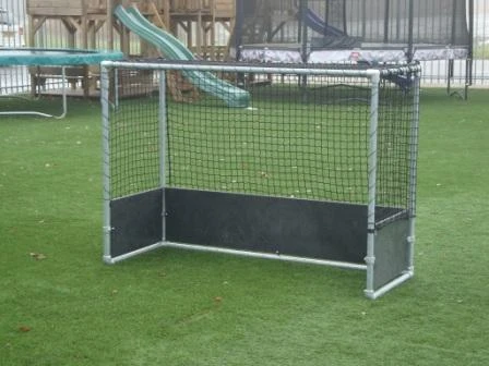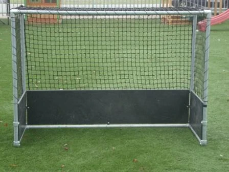 Gegalvaniseerd stalen hockeydoel met ruime afmetingen en voorzien van robuuste onderhoudsvrije HDPE kunststof boarding.