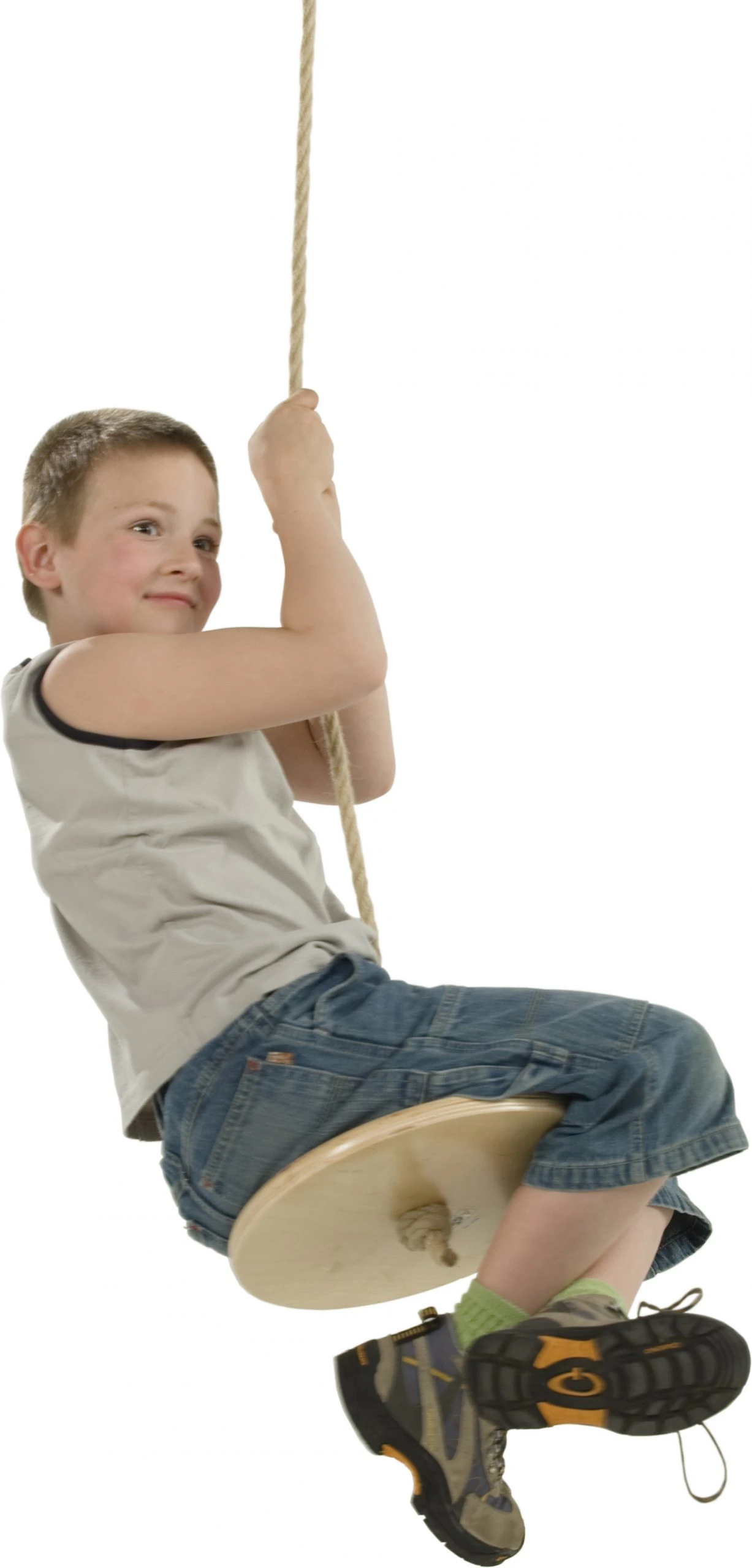 Slingeren als een aapje met deze verniste multiplex schotel aan een 12 mm. Polyhemp-touw. De stelachten en ringen zijn gegalvaniseerd.