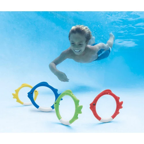 De Dive Rings van Intex staan rechtop in het zwembad zodat ze goed op te duiken zijn. De kunststof ringen worden geleverd in een set met 4 verschillende kleuren.