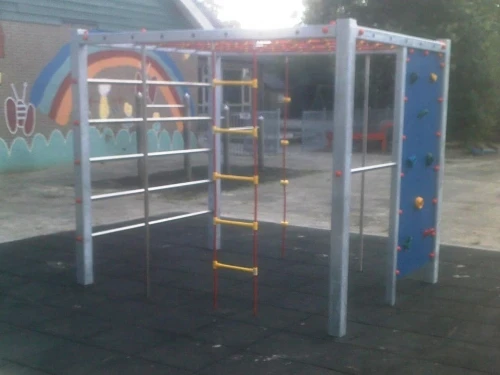 Solide klimkubus van stalen staanders en bovenliggers. Compleet met klimnet, klimmuur, klimsporten van rvs, 2 glijstangen, een duikelstang, een touwladder en een knopentouw. Compleet met betonankers om zelf te storten.