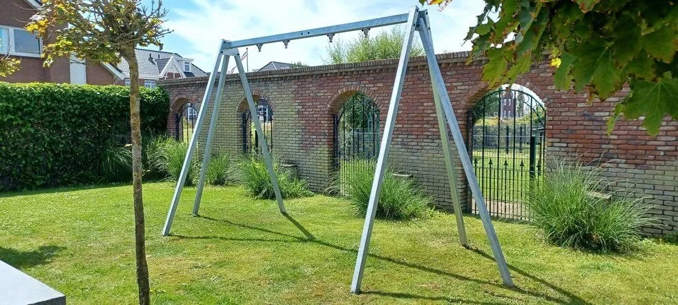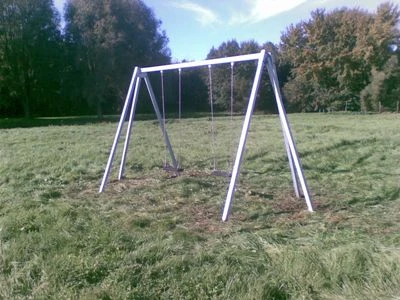 Een zeer solide schommel bestaande uit 6 staanders van thermisch verzinkt staal, met 4 schommelhaken. Incl. 2 rubber zittingen.