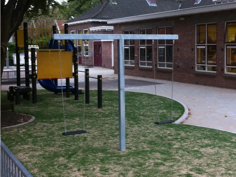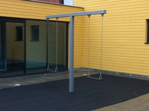 Termisch verzinkte schommel. Neemt weinig ruimte in. Zelf te betonneren. Schommelhaken van roestvast staal. Incl. 2 rubber zittingen.
