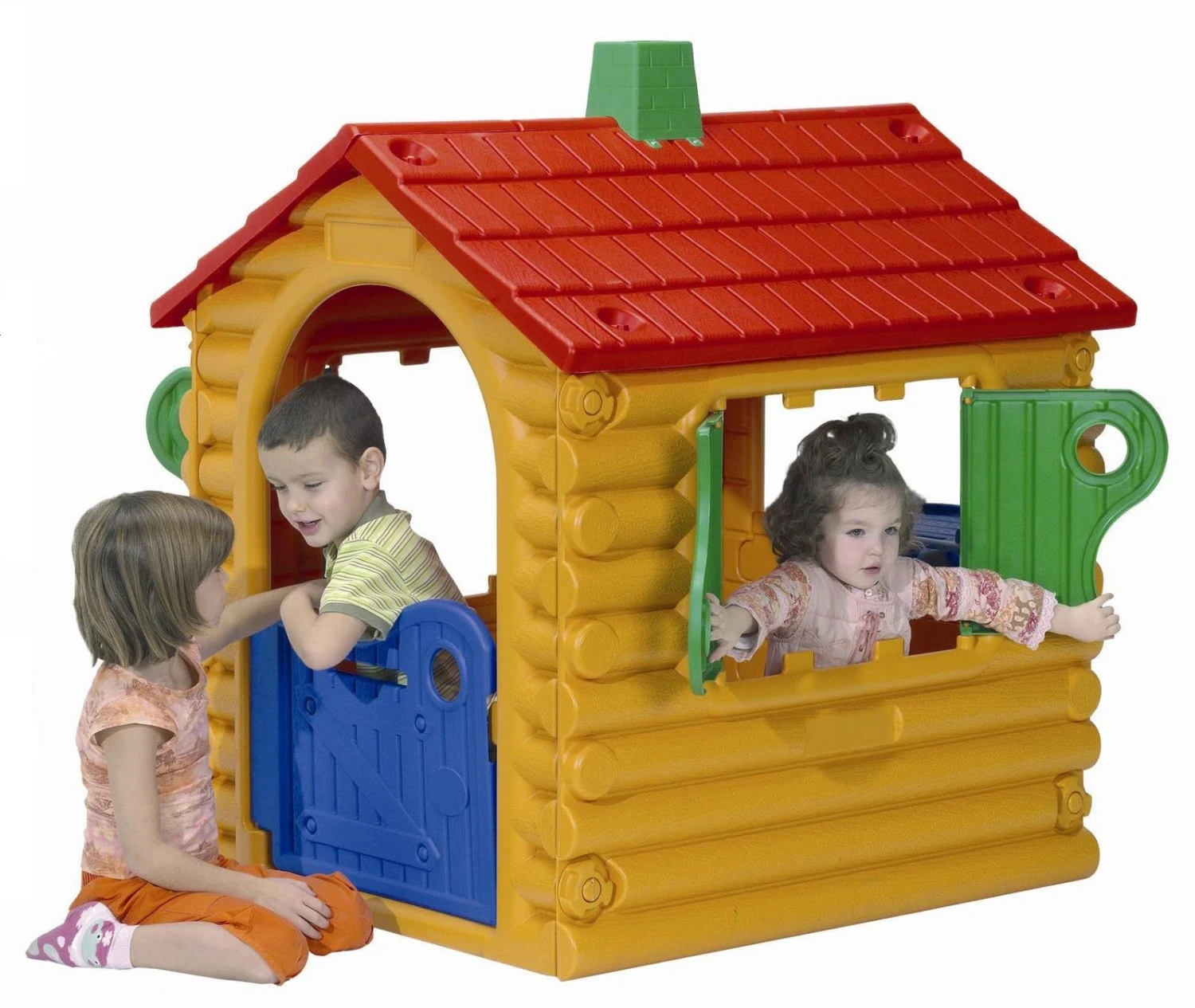 Vrolijke blokhut, met deurtje, ramen met luikjes en een klaptafeltje. Afmetingen l x b x h: 92 x 108 x 125 cm.