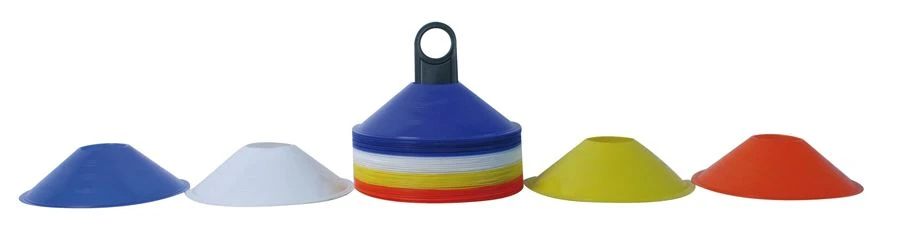 Set met 40 afbakenpionnen. Vervaardigd uit flexibele kunststof, diameter 20,5 cm. en hoogte 5 cm. Inhoud set: 10 x blauw, 10 x rood , 10 x geel, 10 x wit met zwart draagrek.
