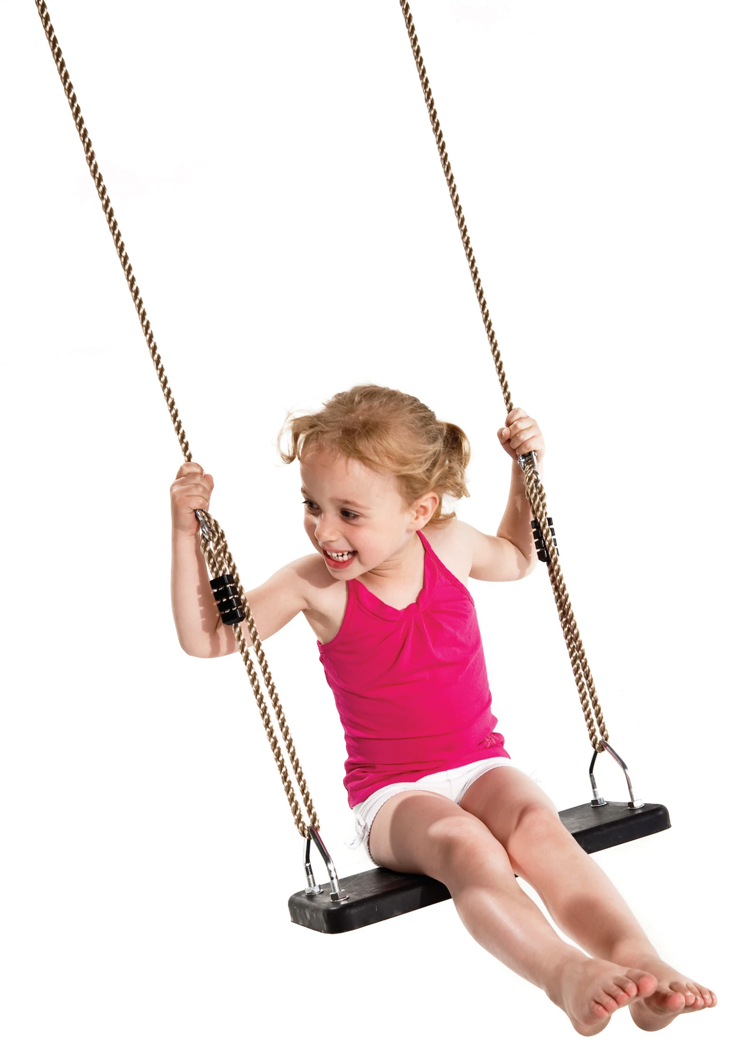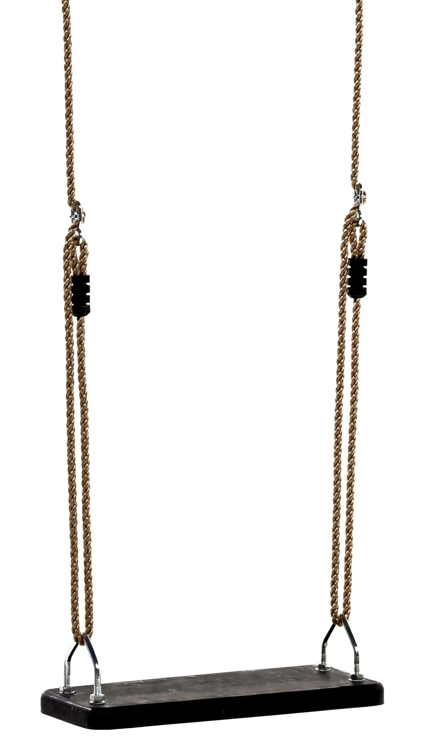 Rubber schommelzitje (stalen inleg) met 10 mm. PP-touwenset. Beugels, stelachten en ophangogen uit gegalaniseerd staal. Zwarte kunststof lassen als touwverbinding.