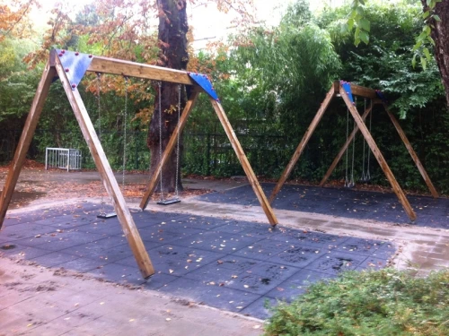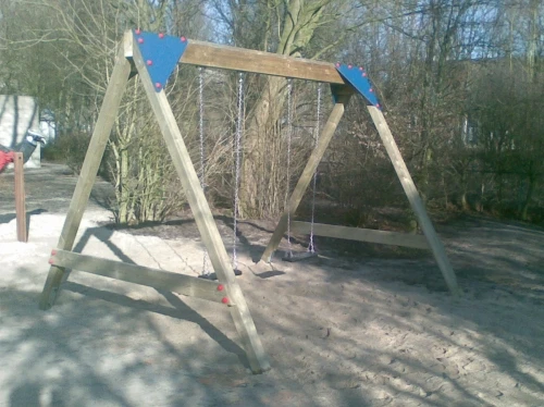 Zwaar uitgevoerde geimpregneerd houten schommel. De schoren zijn gemaakt van gekleurd extoriet.