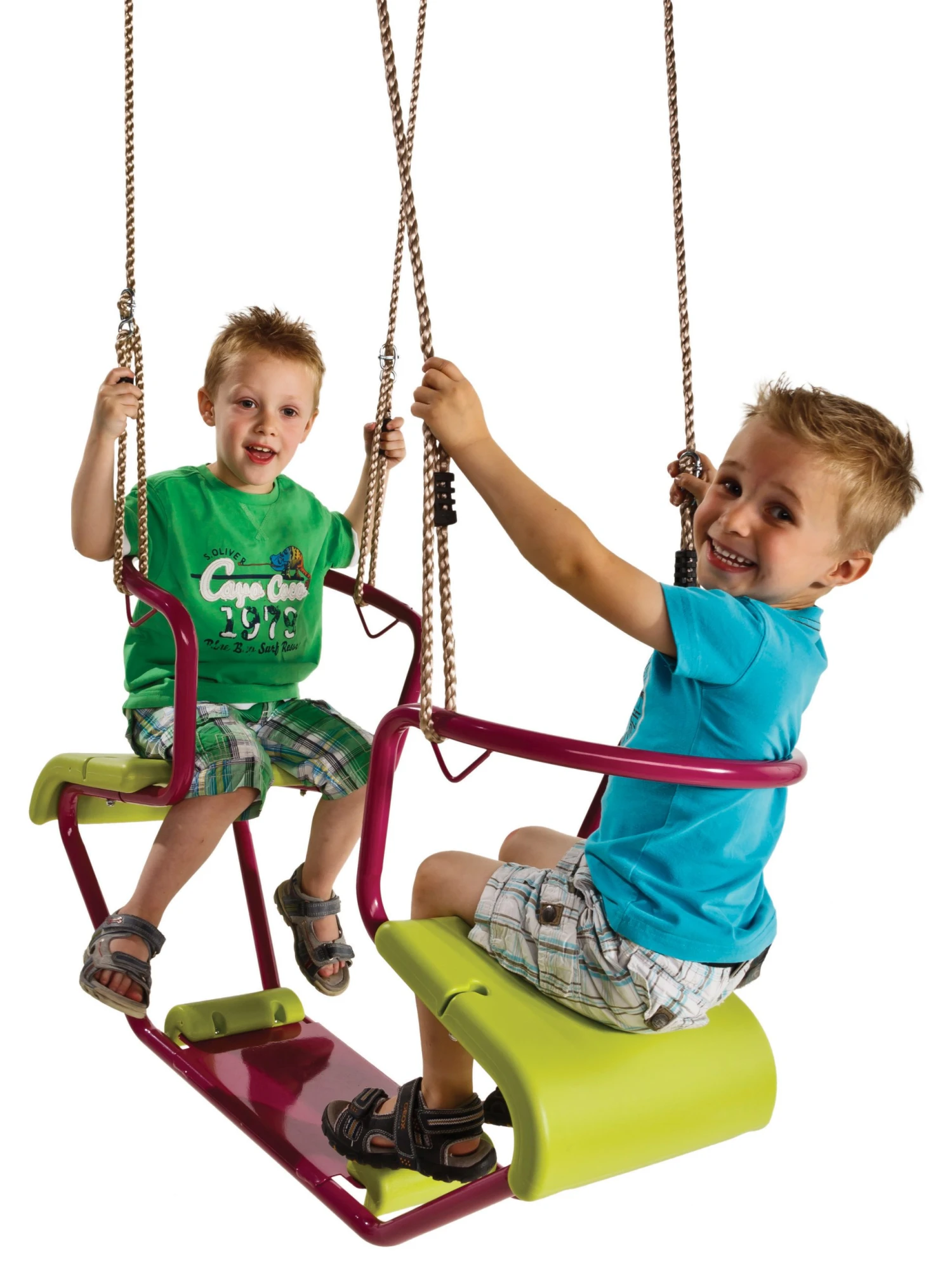 Metalen schommelschuitje afgewerkt met poedercoating. De zitjes en de randen van de voetenplank zijn afgewerkt met geblazen kunststof. Het geheel wordt opgehangen met een 12 mm. PH-touwenset. Uiteraard zijn de stelachten en ophangogen uit gegalvaniseerd staal. De touwverbindingen zijn gemaakt met kunststof lassen.