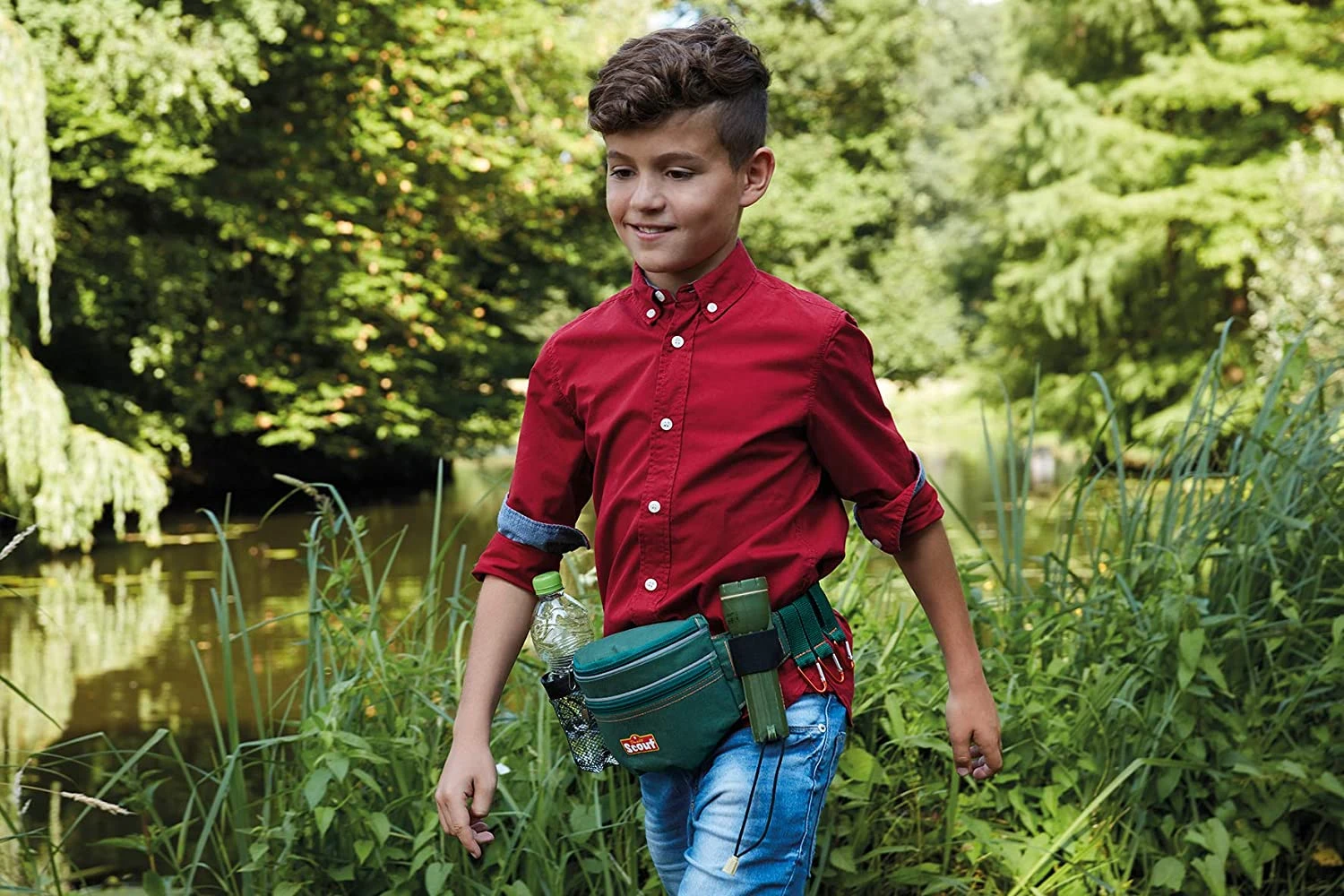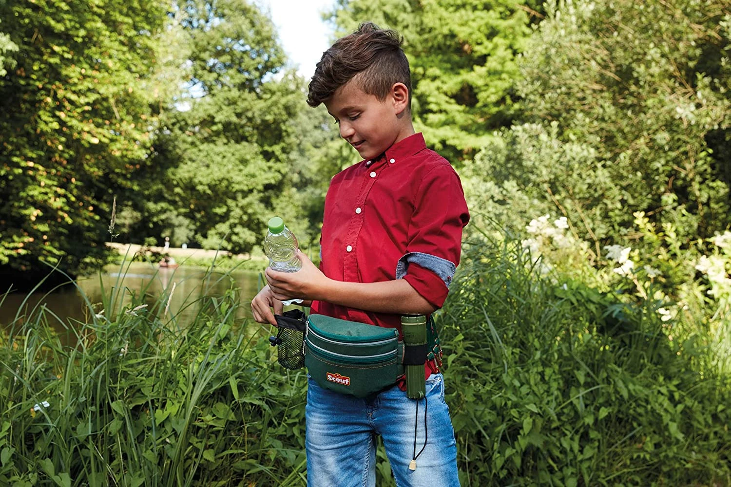 Heupgordel met zaklamp voor de echte natuurontdekker. Verstelbaar van 50 – 90 cm., Compleet met tasje voor kleine materialen, een bidonhouder en 3 karabijnhaken waaraan allerlei ontdekkersspullen zoals een kompas etc. bevestigd kunnen worden.