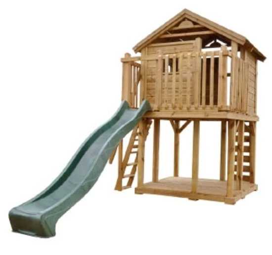 Standaard is de bovenverdieping uitgevoerd met 4 wanden waarvan 2 met raamkader en een 60 cm. diep balkon.Standaard voorzien van trpa met platte treden en een klimweand met gekleurde klimblokken. De glijbaan en vloer zijn optioneel.
