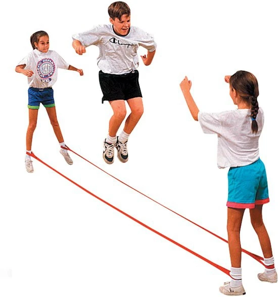 Deze soepele elastieken dienen aan de enkels van twee deelnemers bevestigd te worden waardoor een derde deelnemer talrijke spring- of ritmische activiteiten kan beoefenen. Kleur : rood