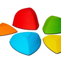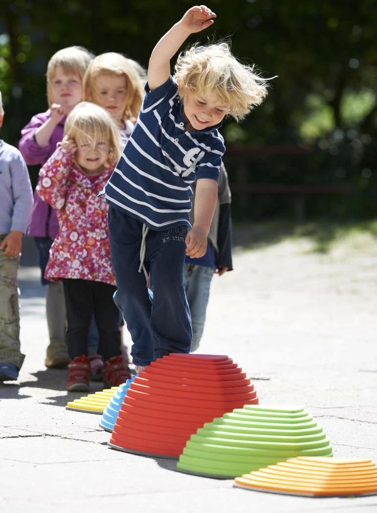 Set van 5 ‘heuveltoppen’ in verschillende hoogten die kinderen ertoe aanzetten van top naar top te springen. Hill Tops ontwikkelen het visueel vermogen van kinderen om afstanden in te schatten en maken ze vertrouwd met hoogten.