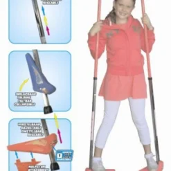 Meervoudig verstelbare stelten in kobaltblauw en rose. Compleet met extra steun voor beginners, welke verwijderd kunnen worden wanneer de vaardigheid en het zelfvertrouwen dit toelaten. De stelten kunnen versteld worden in lengte van 160-180 cm.