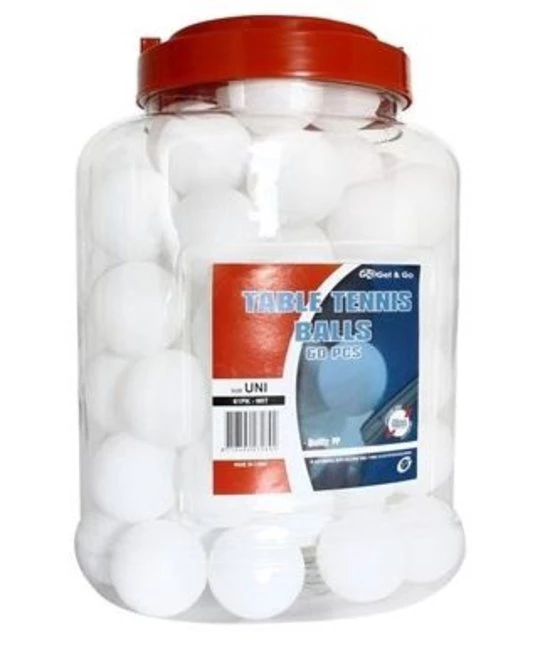 Naadloze witte PVC tafeltennisballen van Get& Go. De ballen hebben een diameter van 40 mm en zijn per 60 stuks verpakt in een grote kunststof pot met schroefdeksel. Ideaal voor bijv. op de camping, basisschool of recreatieruimte. Nooit meer een tekort aan tafeltennisballen