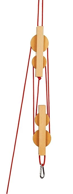 Beukenhouten takel met 4 tandwielen met diameter 8 en 10 cm. en 12 m. koord. Met deze takel mag maximaal 50 kg. getakeld worden.