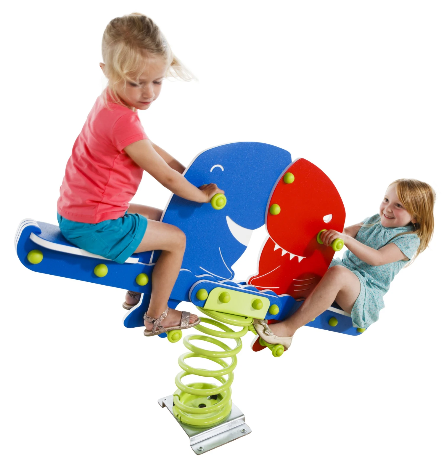 Veerdier in de vorm van 2 haaien waarop 2 kinderen tegelijkertijd plaats kunnen nemen.