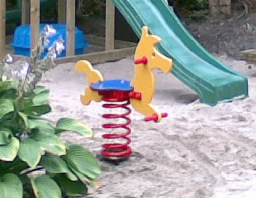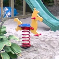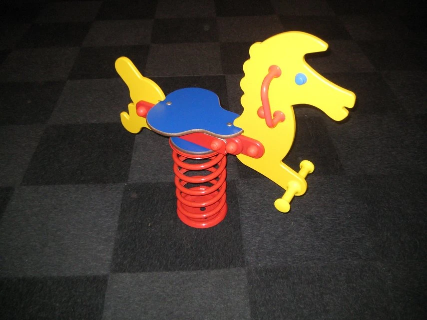Veerpony in massieve kunststof met versterkte kunststof handgrepen en voetsteunen.